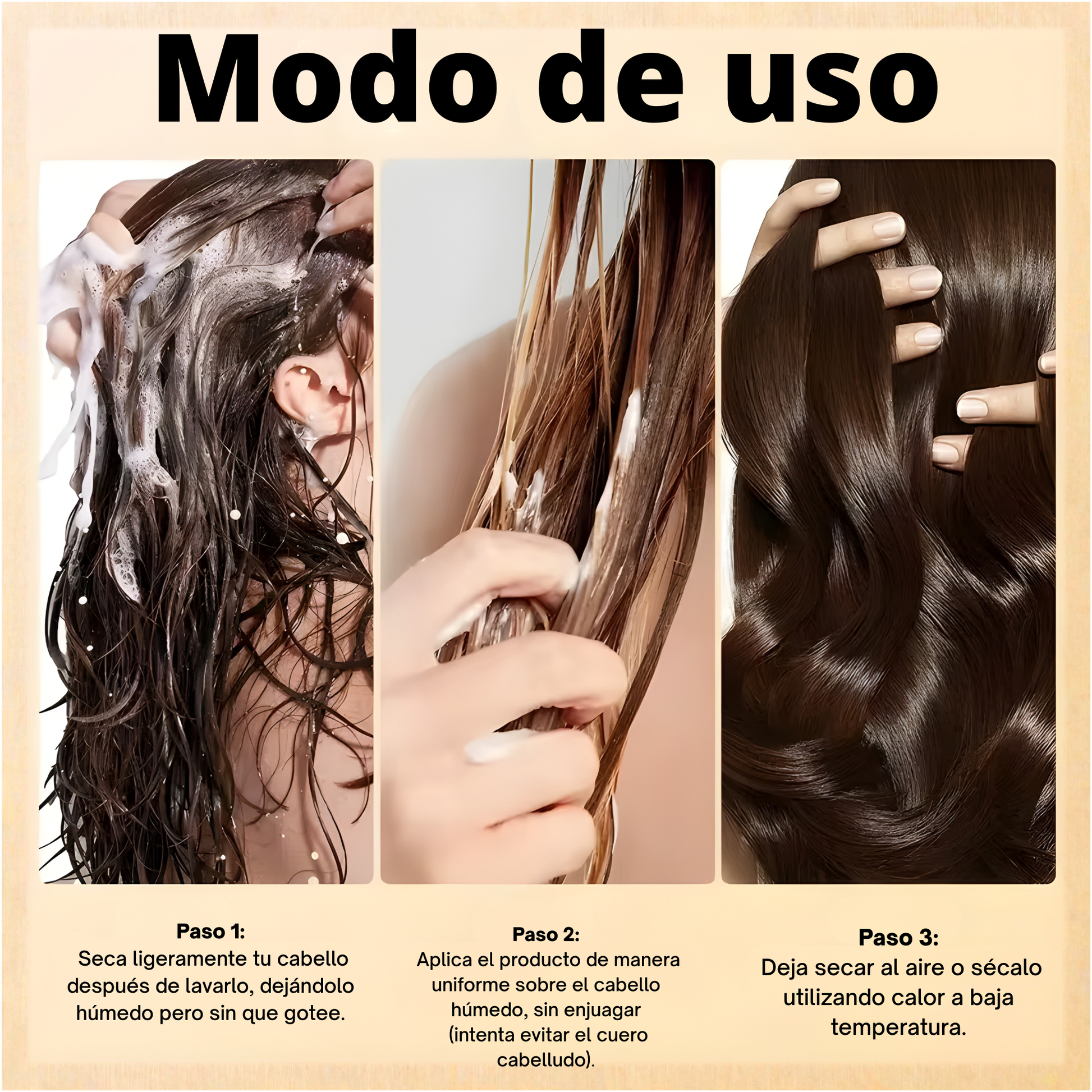 Aplica una cantidad adecuada del producto de manera uniforme sobre el cabello húmedo, distribuyéndolo de medios a puntas. No enjuagues y procura evitar el contacto directo con el cuero cabelludo para mejores resultados. -